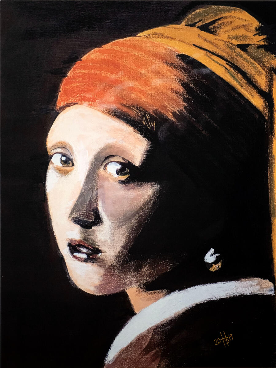 Das Original meiner Hommage an Jan Vermeers „Meisje met de Parel“ hat bereits 2018 seinen Liebhaber gefunden. 2019 habe ich eine Reproduktion auf Leinwand herstellen lassen und mit Acrylfarbe signiert.